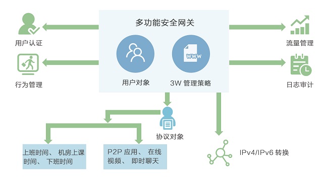 集上网行为管理、路由、防火墙、智能流量管理、用户认证、负载均衡、链路健康检测、防DDos攻击等功能为一体;